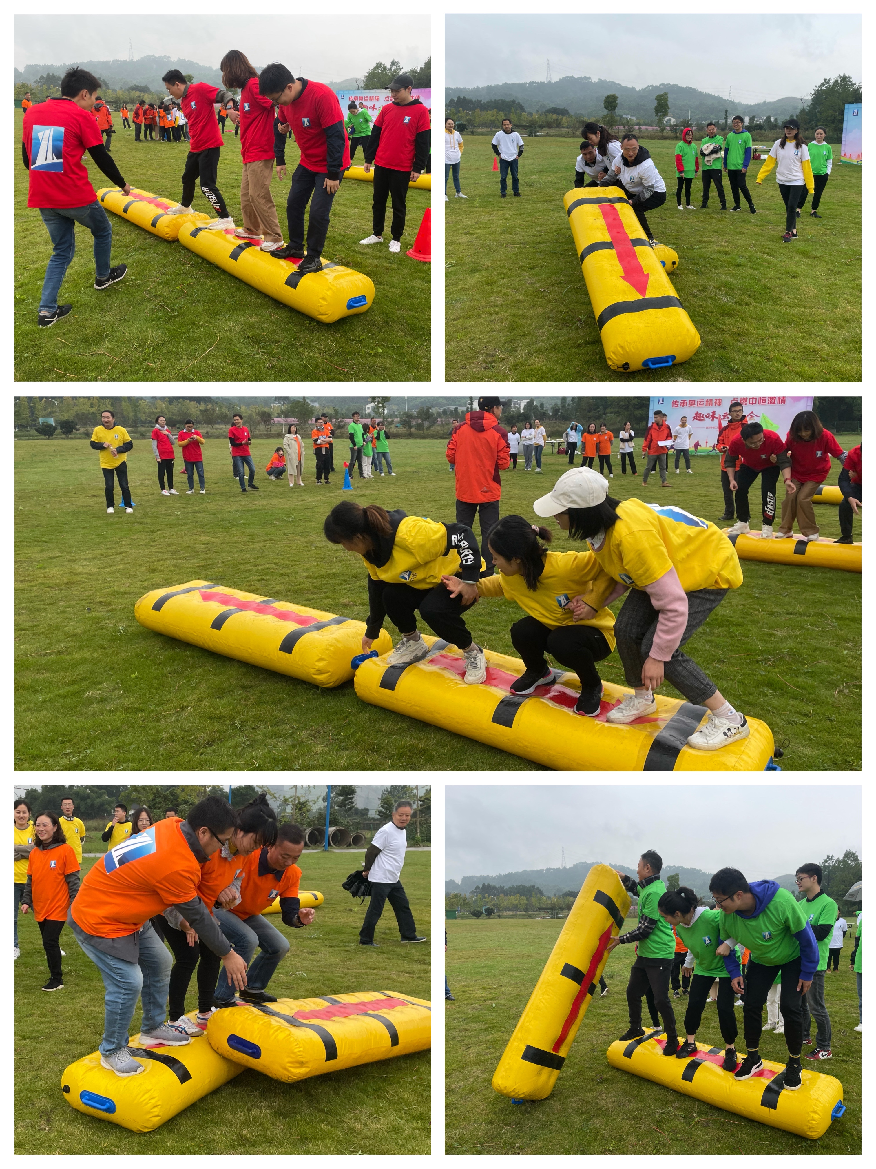 团队成员三人一组,同时向前翻滚充气铅笔,最快抵达终点的团队获胜。
